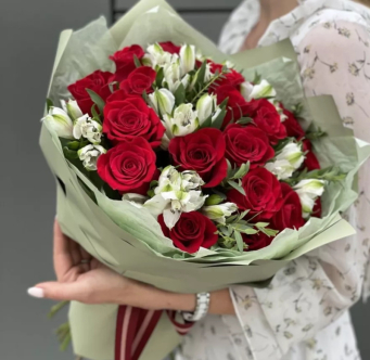 - Альстромерия и розы -классическое и элегантное сочетание, добавляющее букету объема и роскоши.