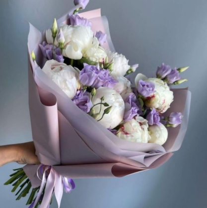 Белые пионы и сиреневые лизиантусы | Купить букет в Новосибирске